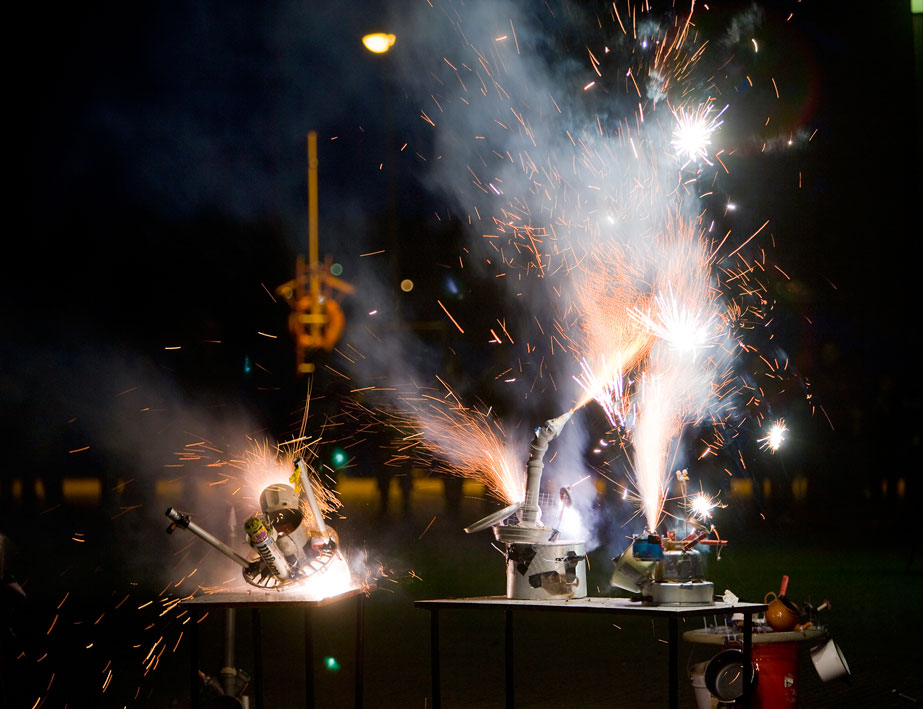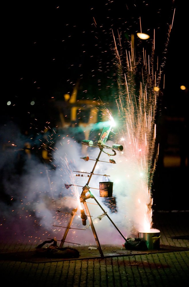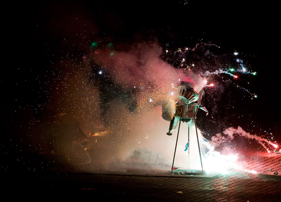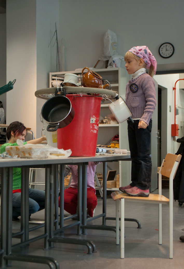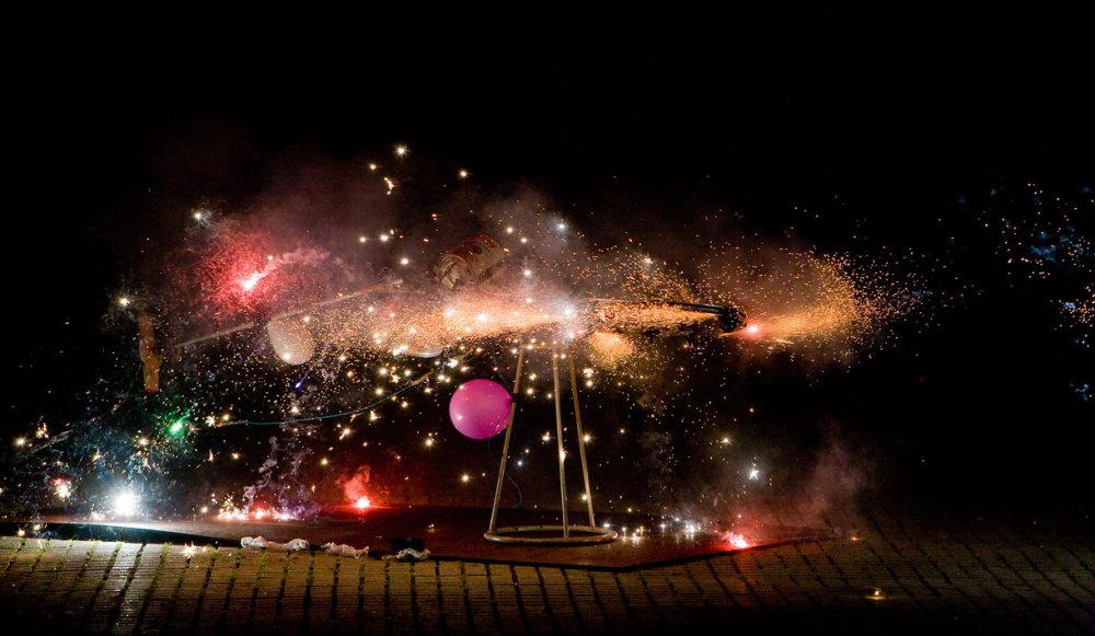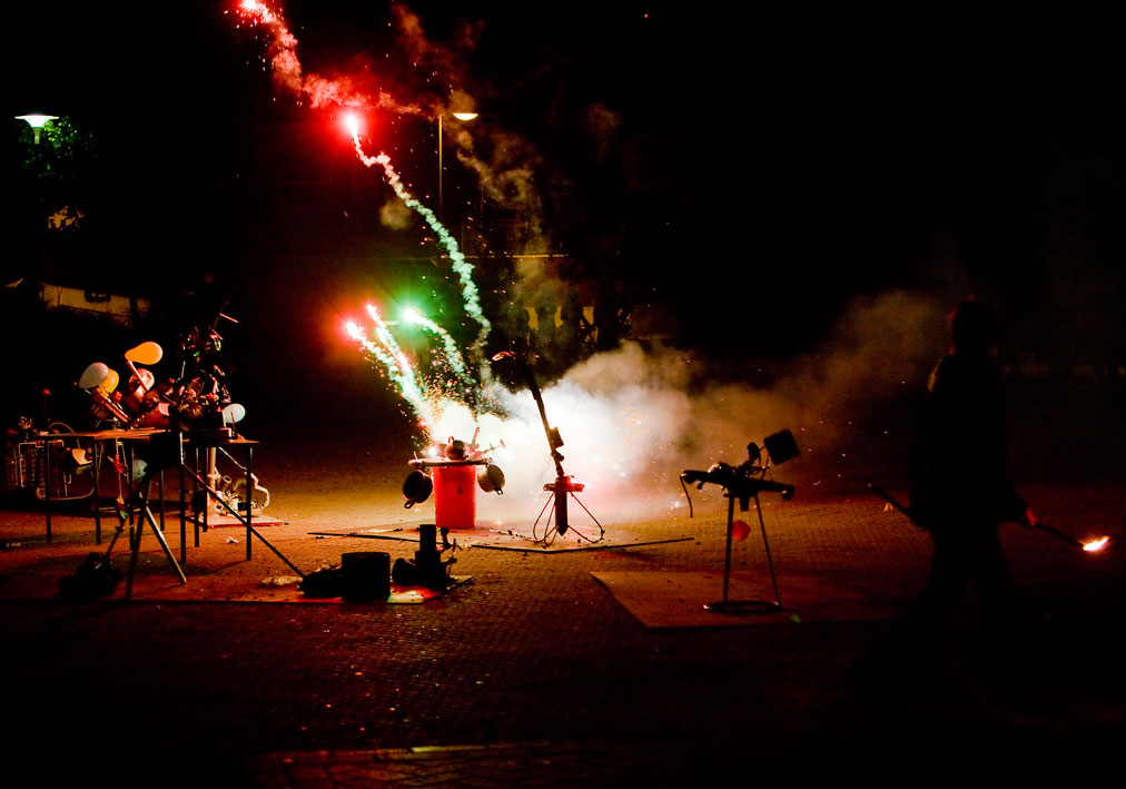 Gwendoline Robin work with children in producing a collaborative piece of art. The children create imaginative launch-pads for a firework display.