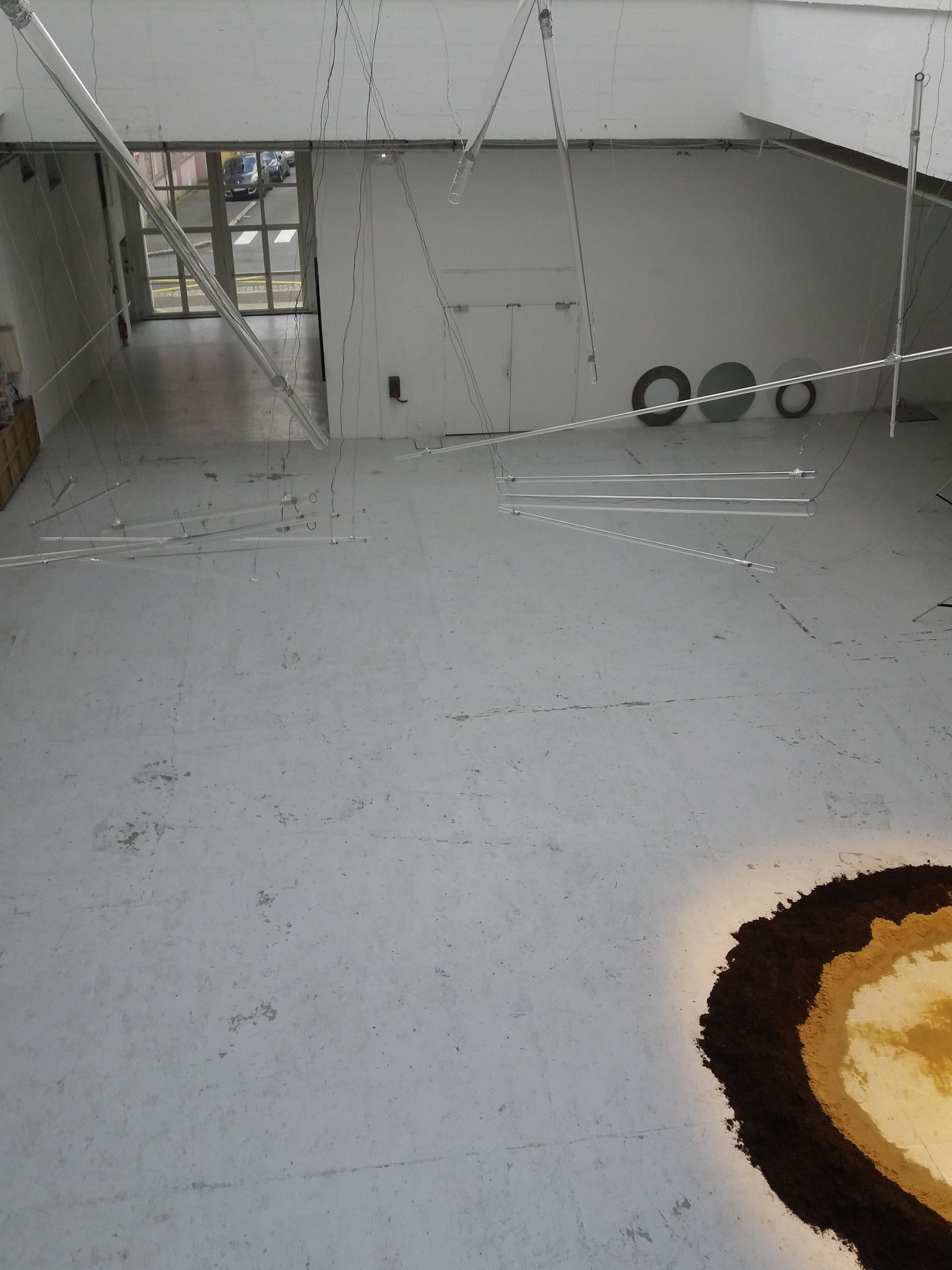 La gravitation, force responsable de la chute et du mouvement des corps célestes, a inspirée G.Robin pour mettre en dialogue l’espace de Passerelle Centre d’art contemporain avec les corps, les matériaux et la lumière en mouvement. Un paysage de matières en attente, évoquant des déserts terrestres et des espaces célestes.