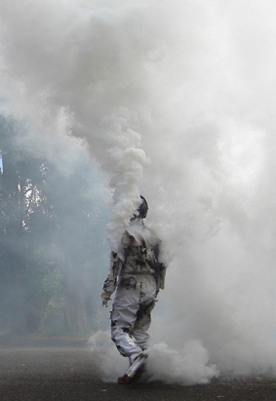 J’attache aux avant-bras et aux pieds, des capsules de fumigènes. je piège ma combinaison et casque de mèche explosive. J’allume une mèche lente qui après quarante secondes déclenche l’explosion sur ma combinaison et casque et simultanément allume toutes les capsules. J’apparais et disparais dans un nuage de fumée. Je marche lentement et déplace petit à petit le nuage.