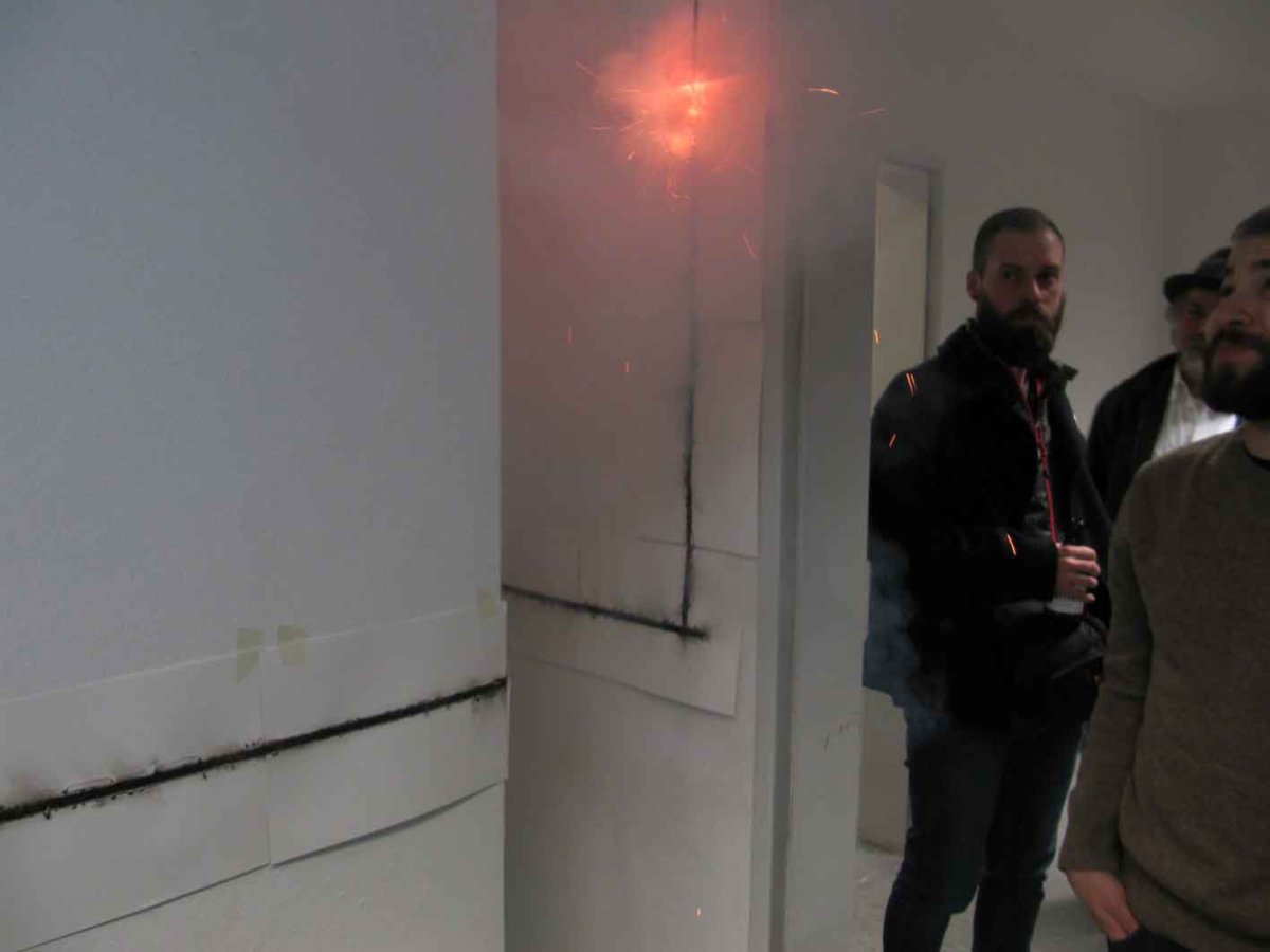 Performance dans laquelle j’expérimente un très petit espace, travail du son avec les tubes en verre et mèches sur papier. Dessin dans l’espace du lieu avec la trace.