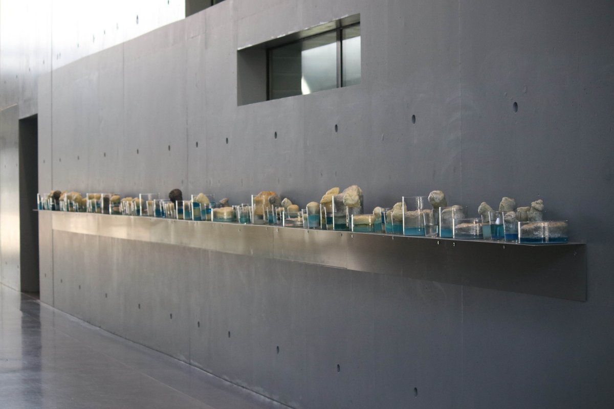 Les paysages de sels, les océans déchaînés, les mers congelées des lunes de Jupiter, les paysages arctiques, les mares acides, les carottes de glaces, les pluies de météorites inspirent Gwendoline Robin. Chez elle, rien n’est figé, tout est matière à manipulation, changement d’état, transformation soit liées au temps, soit par ses gestes. Ses œuvres, réalisées à partir de matériaux instables, constituent des actions, des processus qui rappellent ces paysages de climats extrêmes, ces lieux qui fascinent l’homme. Les différents espaces de l’Onde lui ont permis d’expérimenter les relations entre installations et performances, deux médiums qui ont chacun une temporalité particulière. Elle a pris la mesure de l’architecture particulière de ce lieu pour y installer ses pièces, du sol au plafond. Dans la galerie, au sol, divers objets sphériques de différentes dimensions et matières, récoltés et construits furent le point de départ d’une performance qui eu lieu le soir du vernissage. Ceux-ci font écho à l’installation au mur de lentilles de verre de formats variés, certaines récoltées et d’autres cuites dans des moules avec des métaux. La forme circulaire appelle à de multiples images, de l’infiniment petit à l’infiniment grand. Suspendue, une sculpture composée de tubes de verre sera aussi activée lors de la performance Confluence n°1. Dans la rue traversante, Cratère n°6899, dispositif sculptural offre d’abord une vision d’une eau dormante. Suite à une performance, cette œuvre se transformera au cours de l’exposition telle une matière vivante. L’élément eau se retrouve également au travers d’une ligne de bocaux, posés sur une étagère, montrant divers états de cette matière, solide et liquide. Cette présentation fait apparaître le dessin d’une chaine de montagnes. Ce qui crée un va-et-vient de la matière jusqu’au paysage. Ces correspondances incitent à se souvenir de phénomènes naturels observés, moments qui suscitent l’interrogation et le rêve. Les œuvres de Gwendoline Robin incarnent une certaine idée de l’Univers. Elle s’intéresse en effet à l’astronomie, étude de la galaxie et du cosmos et à la géologie, science qui explore la roche, les pierres et la structure du sol. De même, à travers la scénographie se révèle une relation entre la terre, le ciel et l’univers.