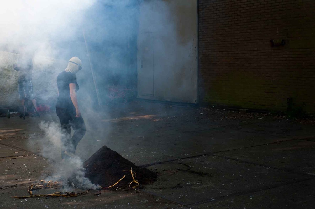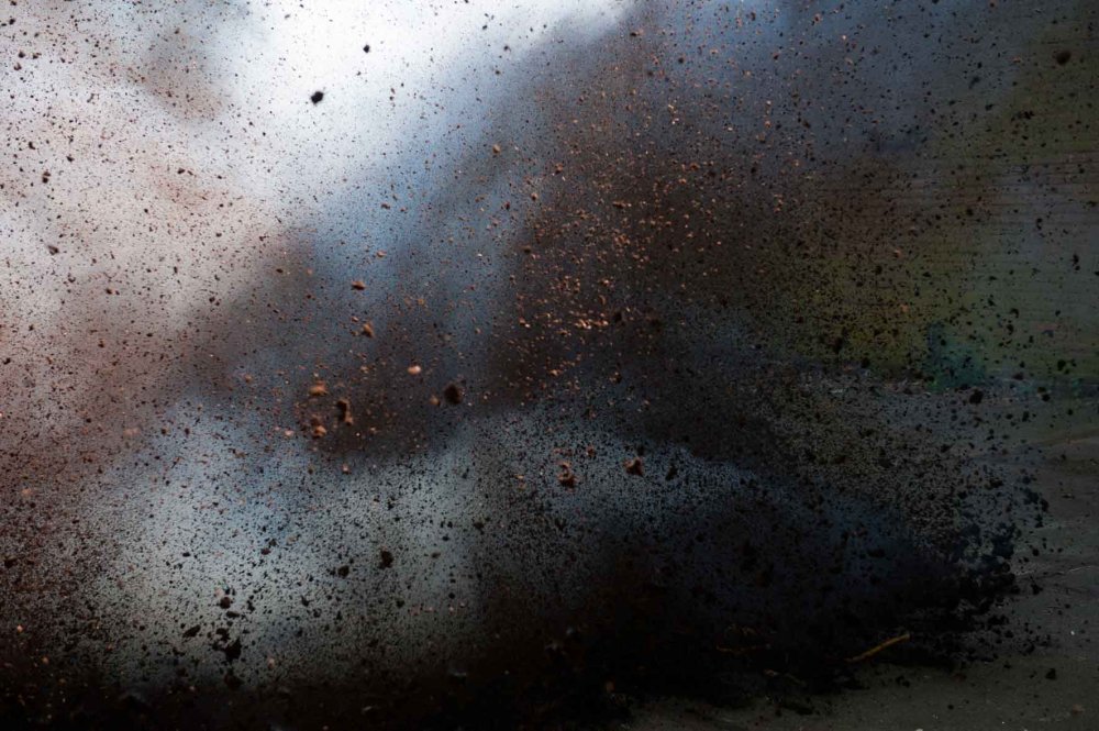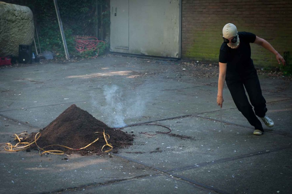 Performance avec tubes en verre, sons et mouvements, explosion de terre.
