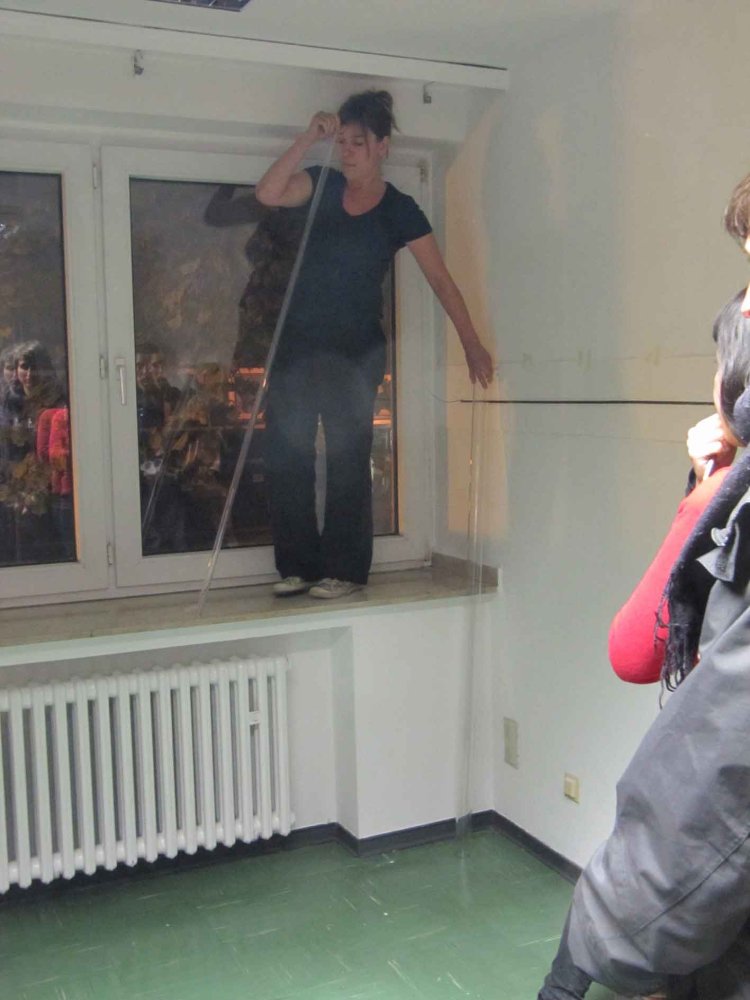 Performance dans laquelle j’expérimente un très petit espace, travail du son avec les tubes en verre et mèches sur papier. Dessin dans l’espace du lieu avec la trace.