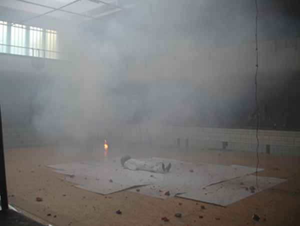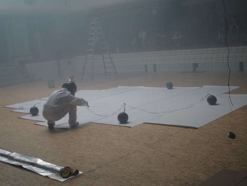 Dans l’espace de la piscine, installation de plusieurs dispositifs dans lesquels je réalise à chaque fois une action.