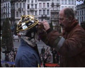 Performance réalisée avec les Pompiers de Bruxelles, pour le Container NICC, Place Anessens, Bruxelles 2000.